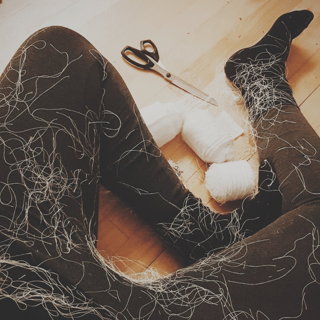 Cette année, j’ai eu l’envie d’aller un peu plus loin, mais sans trop me donner la peine quand même. Je me suis dit: ah ben voilà! je vais me déguiser en momie! Une momie mom, c’est trop parfait, gratuit et si simple… J’ai pris de vieux morceaux de tissu blanc qui s’empoussiéraient dans mon armoire à couture depuis longtemps. Zip zoup zoup, j’ai découpé des bandelettes, cousu ça ensemble pour en faire trois très longues. Mais comme je faisais les bordures, pouf, mon aiguille a cassé. Et là, j’étais en retard, alors au yable la finition, je me suis enroulée ça rapido presto [c’était loin d’être rapide finalement], parce que oui, j’ai vraiment sous estimé la complexité de la momification.