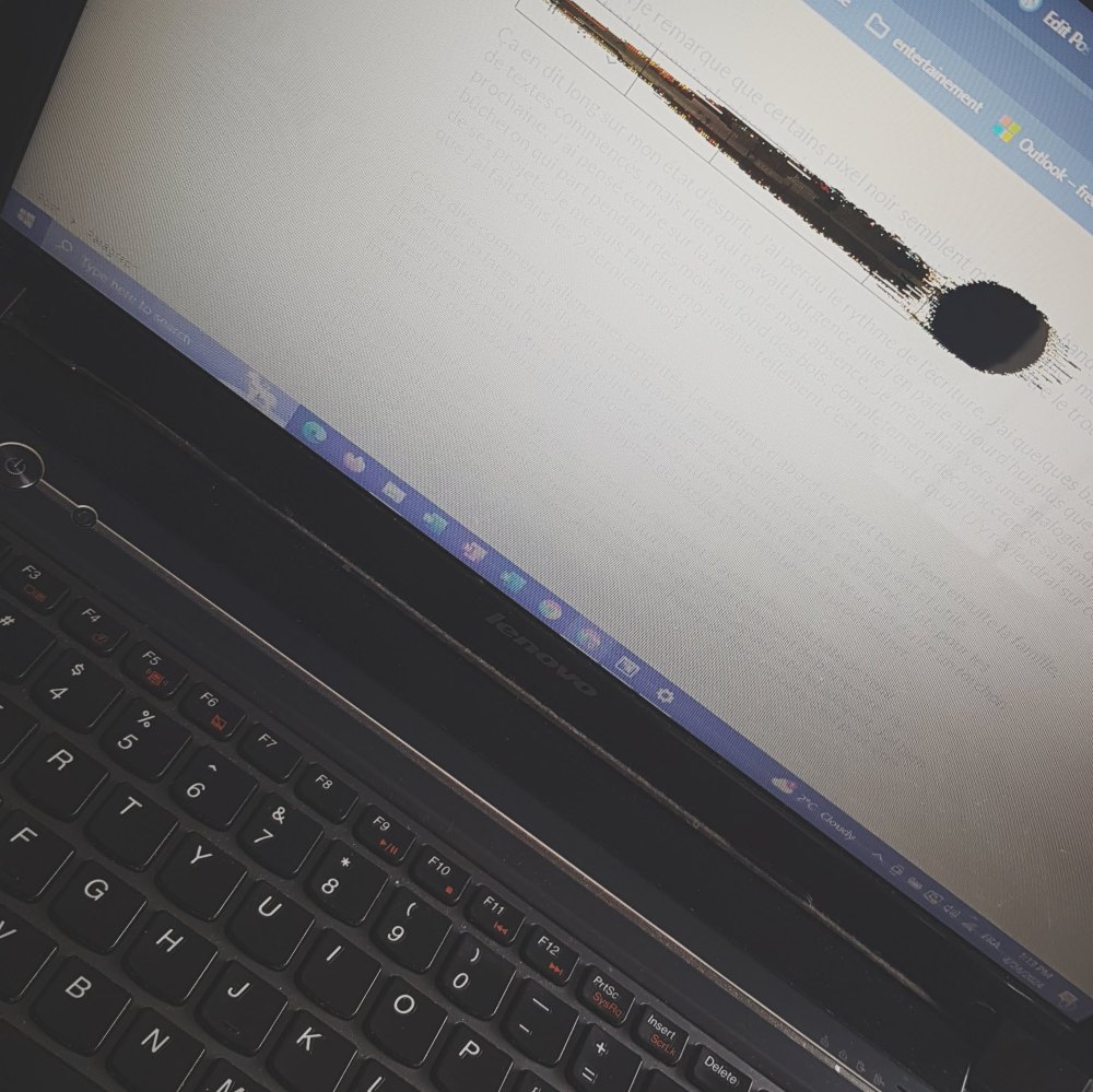 D’ailleurs, je remarque que certains pixel noir semblent migrer. Une bande qui avait été impénétrable depuis plusieurs mois revient à la vie et je peux deviner mon texte qui se déploie au fur et à mesure que les mots me coulent au bout de mes doigts. Le prix à payer semble être le trou qui lui, s’agrandit. Ben coudon! Les enfants vont continuer de trouver ça désespérant regarder les p’tits bonhommes sur le laptop *rire machiavélique* (on en reparlera des écrans)